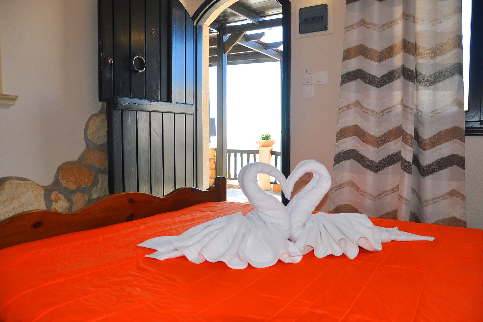 Όλα τα δωμάτια μας είναι φωτεινά και διακοσμημένα με λεπτομέρειες από πέτρα. Διαθέτουν μίνι ψυγείο και τηλεόραση καθώς και ένα πανέμορφο επιπλωμένο μπαλκόνι. Η βεράντα του κάθε δωματίου προσφέρει καταπληκτική θεά στο απέραντο γαλάζιο του Νότιου Κρητικού Πελάγους ή στο βουνό.
